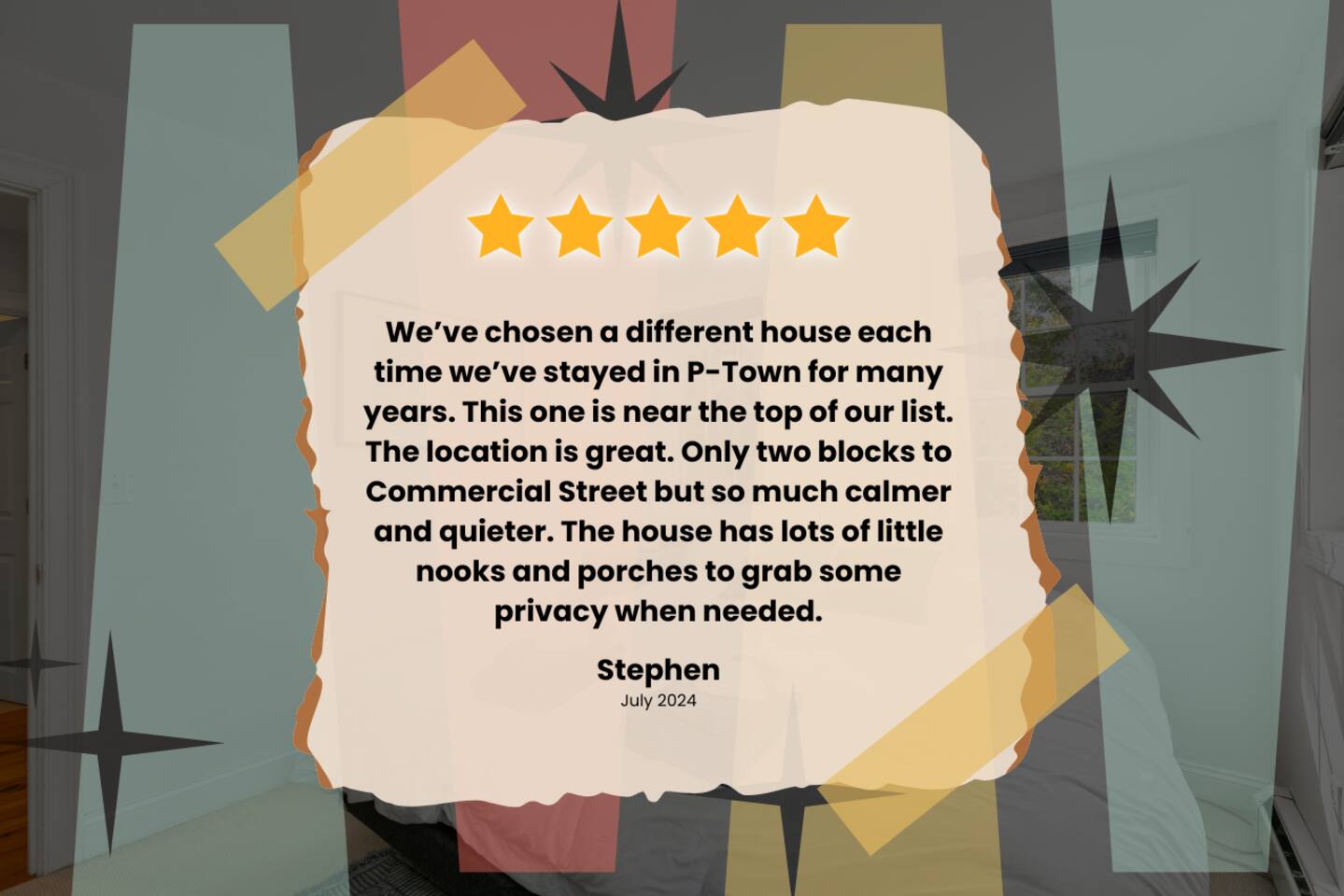 You will LOVE how close you are to everything, but removed from the late-night chaos in the town center. Our home is located on a quiet road between the cemetery and the back side of Motta Field. You can easily access everything in town by foot and, because the ferry is so close to the house, you can get into town by boat from Boston and never need a car. (The Ptown airport is a 7-minute car ride away.) You may want bikes to get to Herring Cove or Race Point Beach — there are two bike shops offering well-priced daily or weekly rentals within a 5- or 10-minute walk. The homes nearby are a combination of year-round residents, seasonal residents, and vacation rentals. Live like a local, but please be mindful that your vacation may be our neighbor's full-time home. When you're coming and going, please be extremely quiet and keep conversations down. Quiet hours are from 8pm - 8am. Please be aware that, like most streets in Provincetown, homes on our street are densely situated, and it’s difficult for us to control any noise from our neighbors. Most of the time when we’re there, we hear nothing.