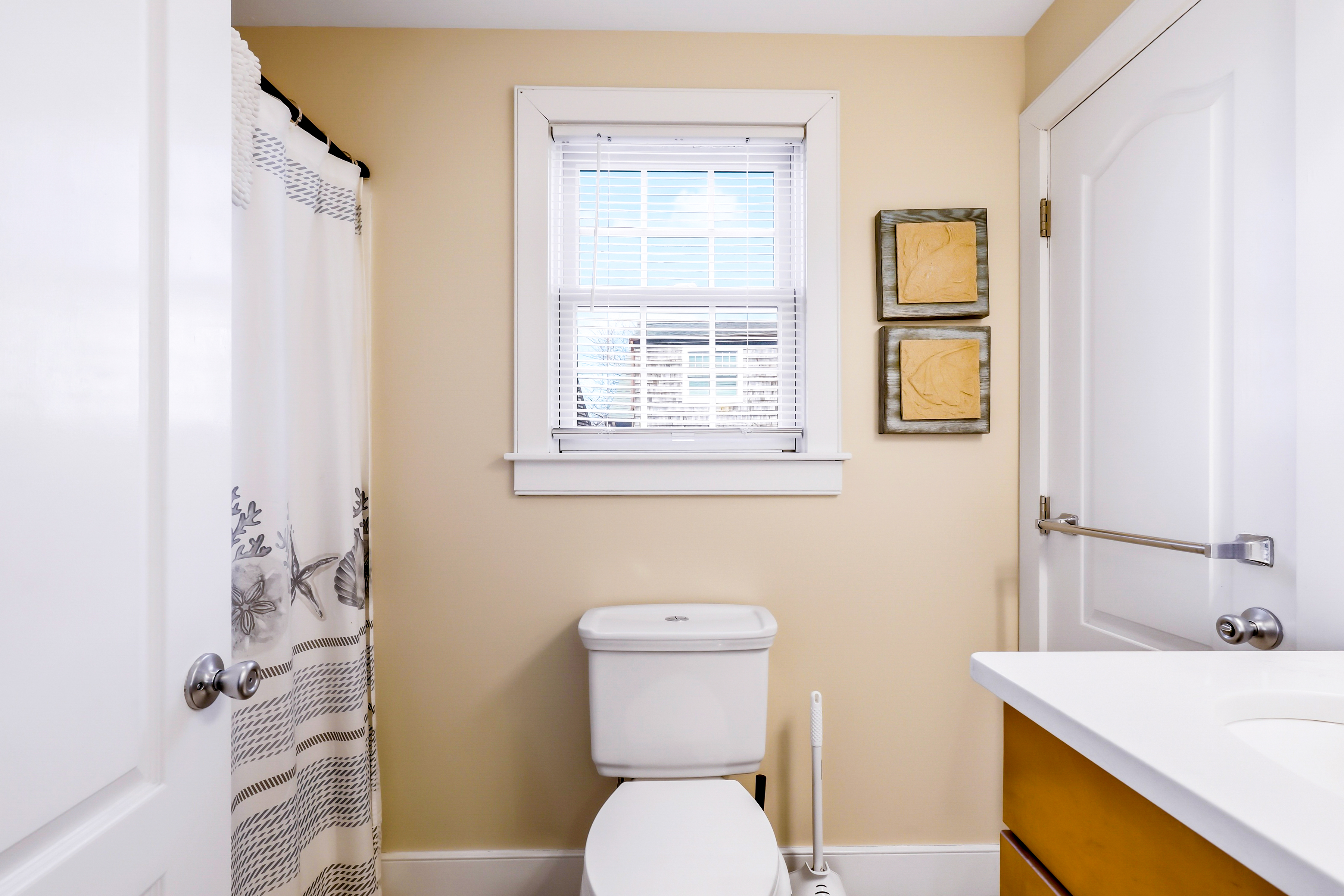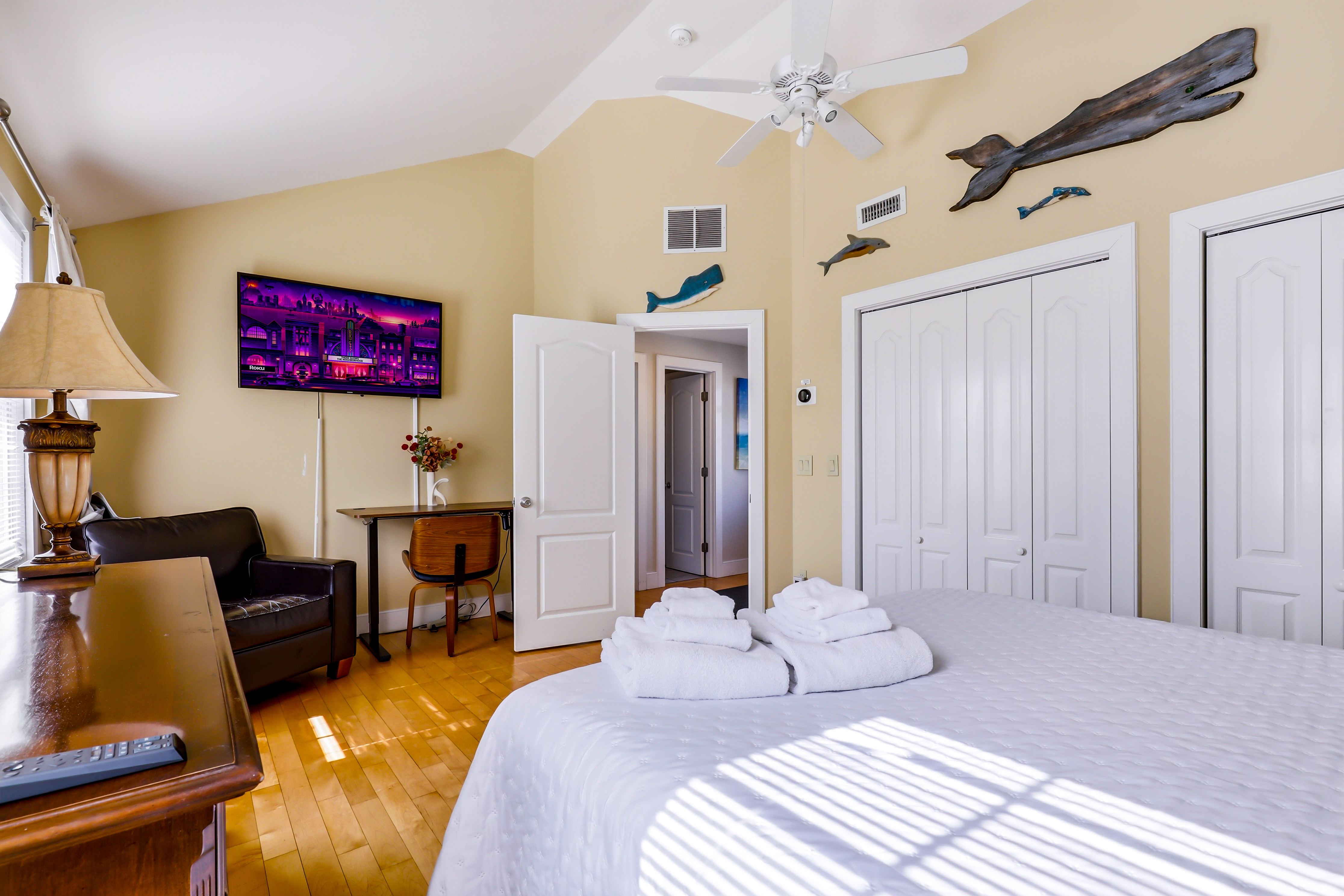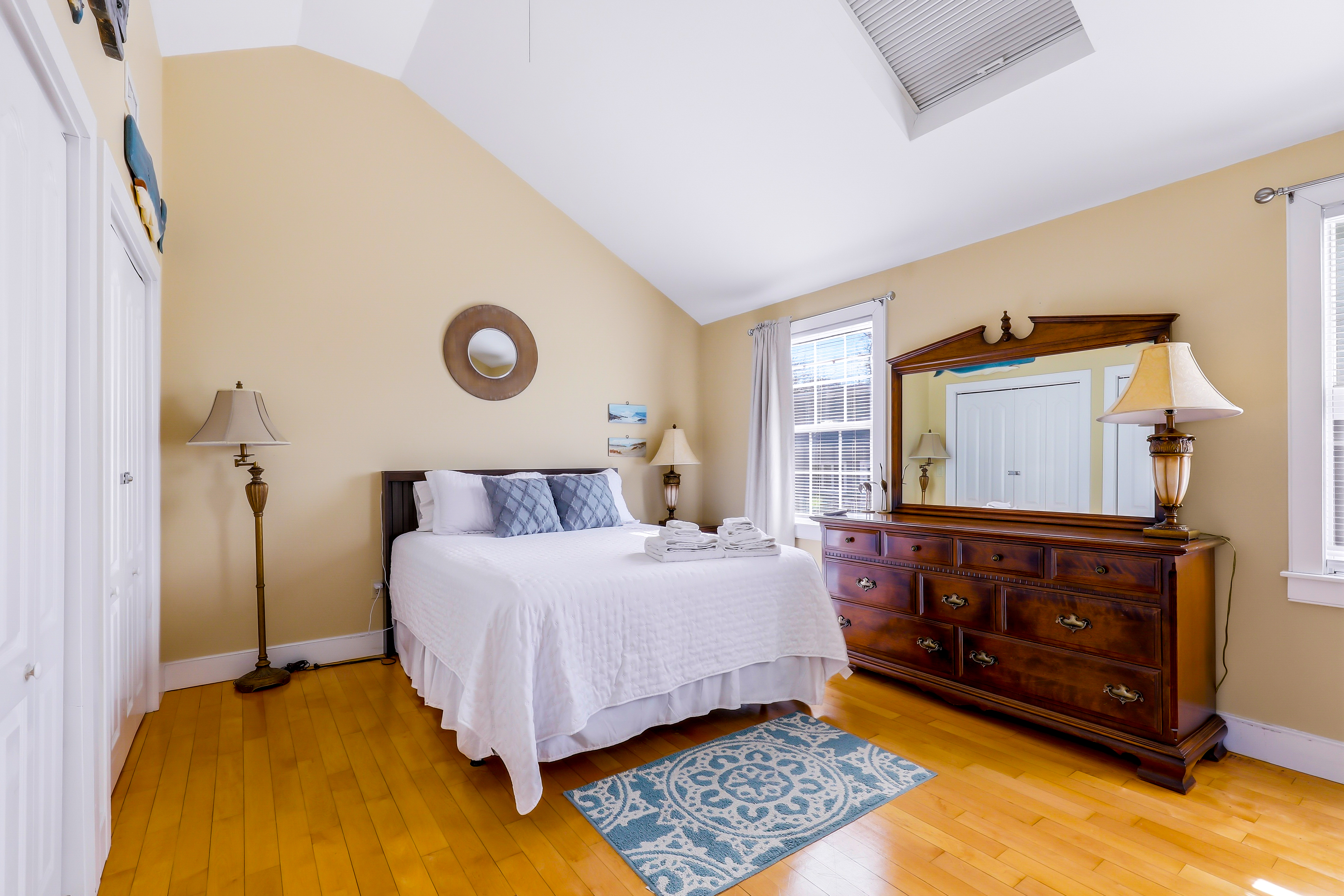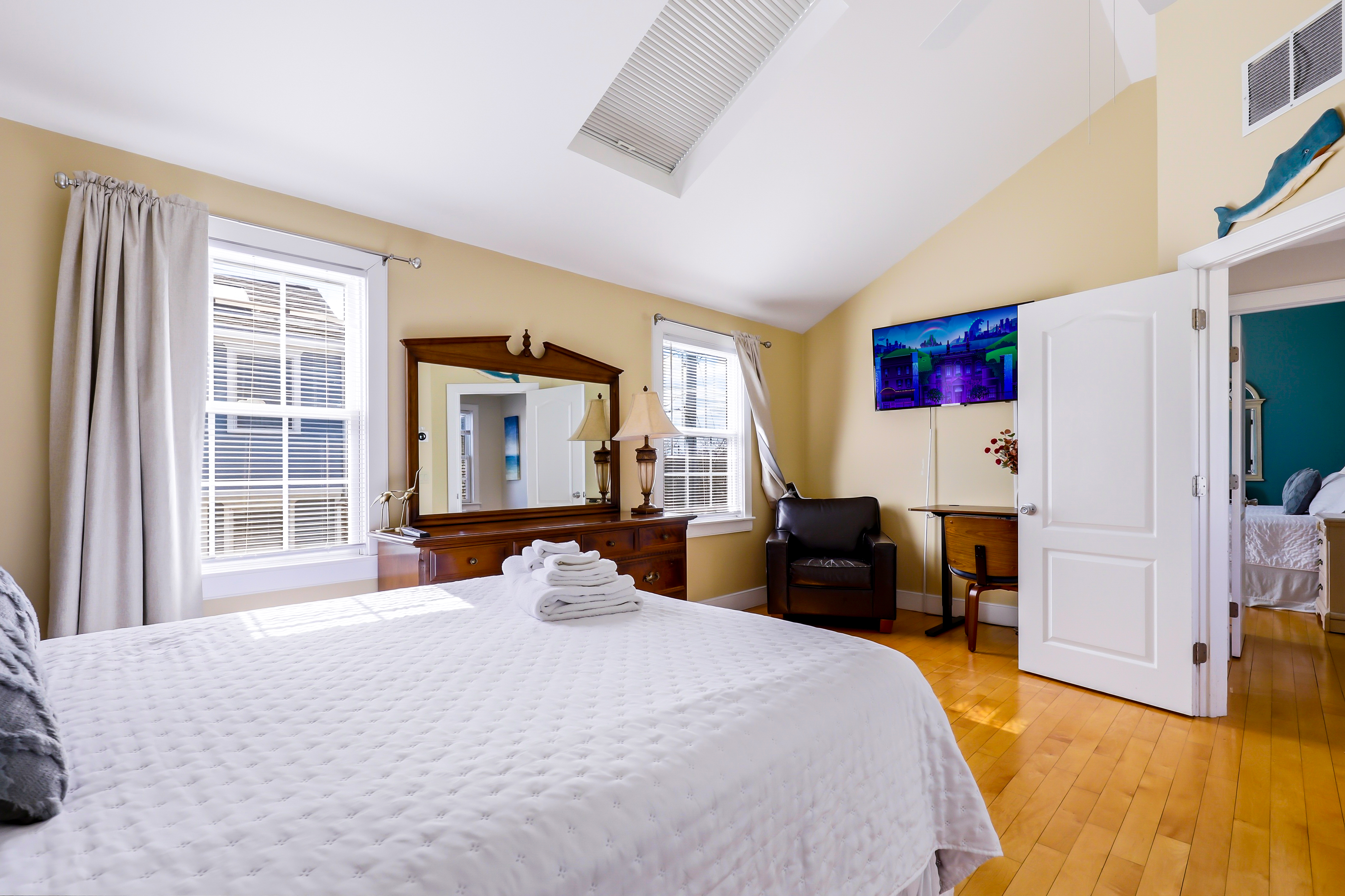 Experience the best of Provincetown from this sun-drenched, two-story luxury condo - just steps from Commercial Street and the Pier, yet tucked away for a peaceful retreat. Enjoy private outdoor spaces, a chef’s kitchen, and dedicated parking, all within walking distance to shops, dining, and the ferry. Key Features ☀ Sleeps 6 - 2 bedrooms (King + Queen) + queen sleeper sofa ☀ 2-story layout with bright skylights and hardwood floors ☀ Prime location - 5-minute walk to Commercial Street & Pepe’s Wharf ☀ Private front porch + secluded patio for relaxing outdoors ☀ Fully stocked chef’s kitchen (including lobster pot) ☀ 2 full bathrooms (main level + second floor)in-unit laundry ☀ Dedicated off-street parking (rare for this location!) ☀ Pet friendly ☀ Fresh pastries from Far Land Provisions right next door ☆☆ BEDROOMS ☆☆ Upstairs, you’ll find two serene and sunlit bedrooms designed for restful nights after a day exploring Provincetown. Skylights fill the space with natural light, while plush mattresses ensure comfort. The primary bedroom features a luxurious king-size bed, creating a true retreat. The second bedroom offers a cozy queen-size bed - perfect for guests or family. Both rooms include AC and their own TVs, giving everyone space to unwind and recharge in comfort. ☆☆ BATHROOMS ☆☆ The home includes two full bathrooms, conveniently located on the main level. It’s fully stocked with body wash, shampoo, conditioner, and all the essentials you need for a comfortable stay. ☆☆ KITCHEN & RELAXING AREAS ☆☆ The open-concept main level is designed for both relaxation and connection. The airy living room features rich hardwood floors and a comfortable setup for movie nights or winding down after a day out. The fully equipped kitchen is ready for anything - from quick breakfasts to full seafood feasts, complete with all cookware and essentials (including a lobster pot). A dining area makes it easy to gather and enjoy meals together, while in-unit laundry adds everyday convenience. ☆☆ OUTSIDE SPACE ☆☆ Enjoy the best of indoor-outdoor living with two private spaces. Sip your morning coffee on the charming front porch - or take a quick step next door to Far Land Provisions for fresh pastries and coffee - then unwind in the evening with drinks on your secluded patio. Leave the car in your dedicated parking spot and explore on foot - everything you need is just steps away. ★☆ Book Today & Let Us Take Care Of You ☆★ Whether you're here for a relaxing getaway or to explore the vibrant energy of Provincetown, this home offers the perfect balance of comfort, location, and style. Book your stay today and enjoy a seamless, memorable experience from start to finish.