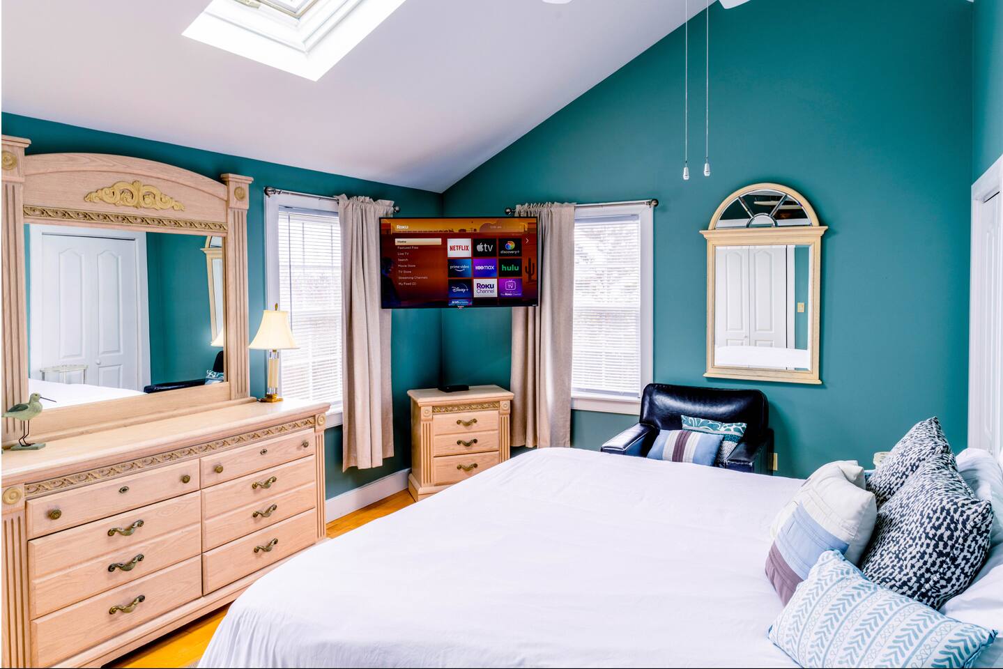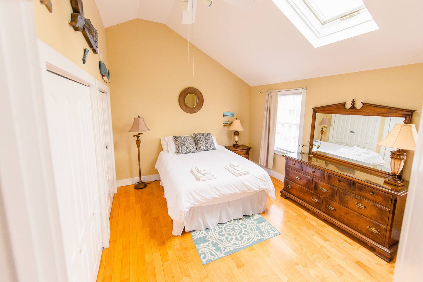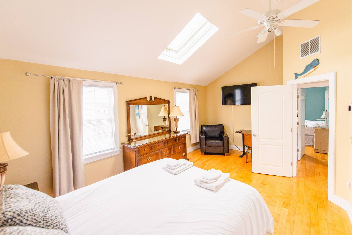 First Floor: Step into a spacious, sunlit living area featuring gleaming hardwood floors, a brand new leather couch and loveseat, and a flat-screen TV. The living room opens to a private front porch and a cozy patio, ideal for morning coffee or evening cocktails. A queen-size pullout sofa bed offers additional sleeping space. The gourmet eat-in kitchen is fully equipped with all the amenities of home—including a lobster pot—along with a full-size refrigerator, gas stove, microwave, and all necessary cookware. A full bathroom and a brand new washer/dryer unit add to the convenience. The back door leads directly to your assigned parking space. Second Floor: Upstairs you'll find two spacious bedrooms, each with brand new mattresses (as of Fall 2022), skylights that fill the rooms with natural light, and flat-screen TVs. One bedroom features a king-size bed, the other a queen, both with hardwood floors and air conditioning for ultimate comfort. This centrally located retreat puts you in the heart of Provincetown, just steps from everything yet tucked away enough to enjoy peace and privacy. Perfect for a relaxing getaway or an unforgettable week by the sea.