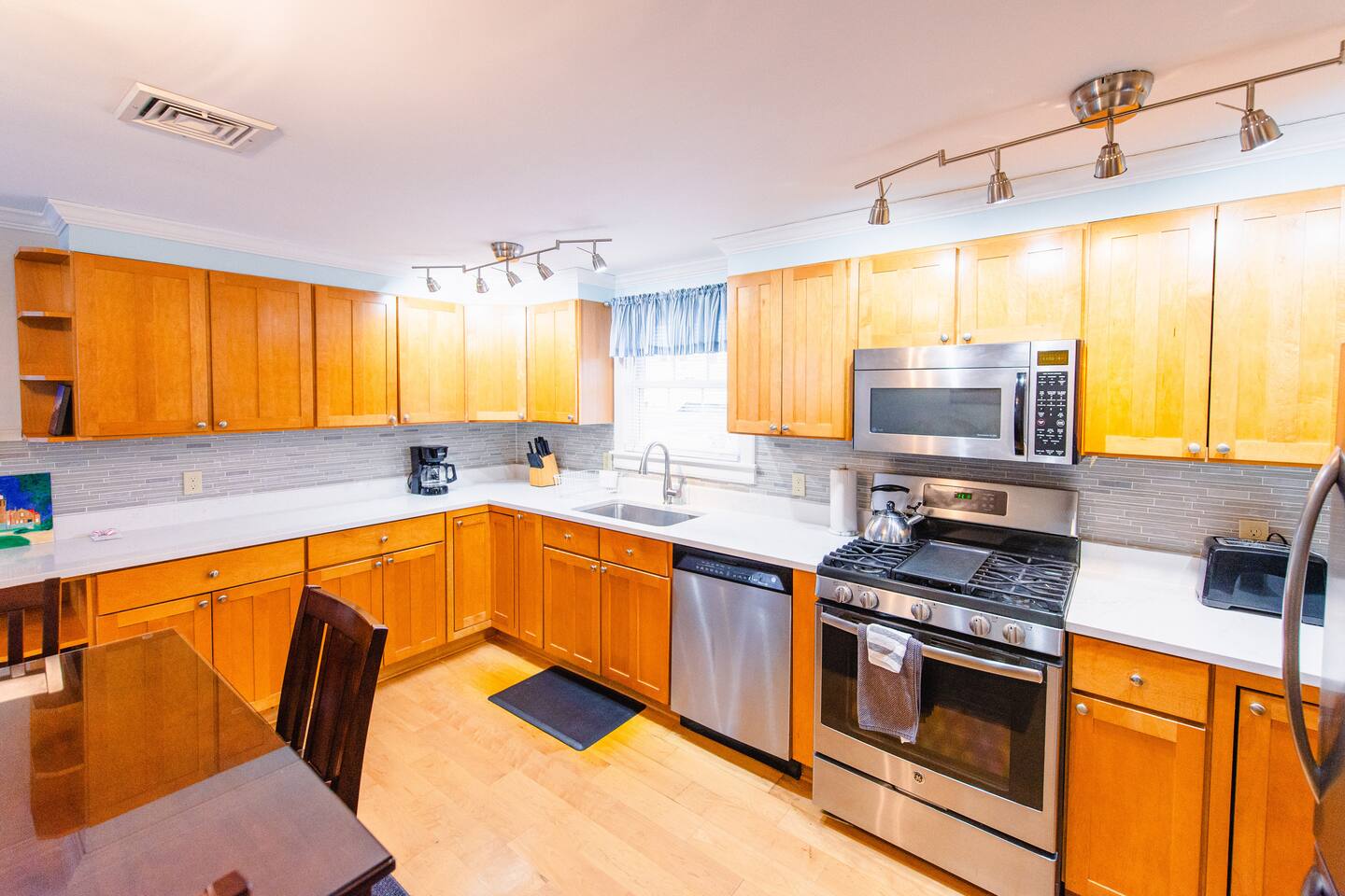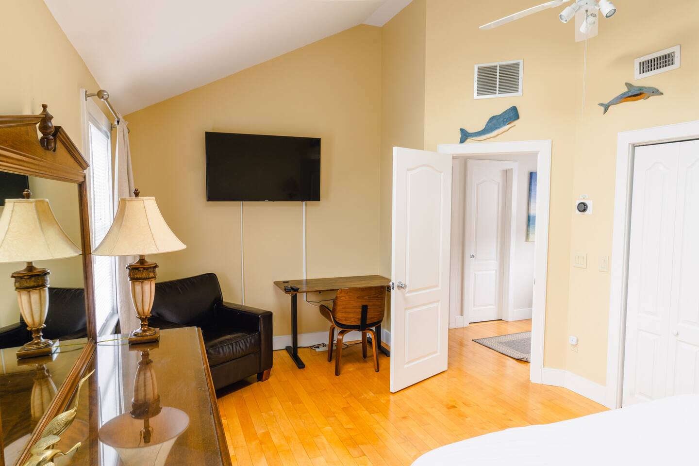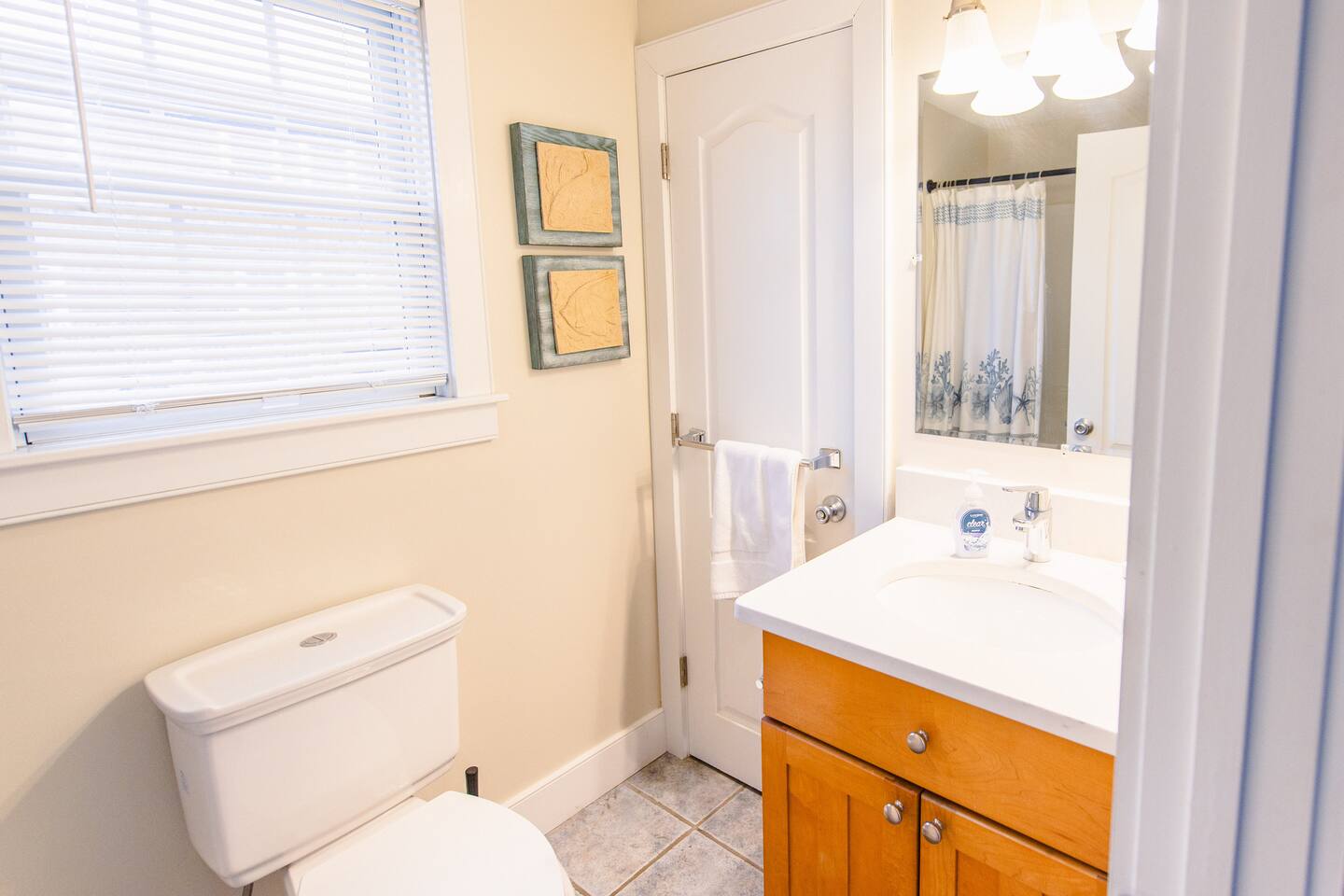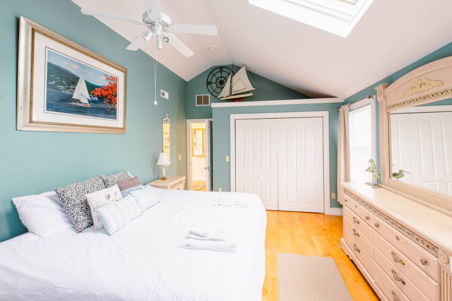 First Floor: Step into a spacious, sunlit living area featuring gleaming hardwood floors, a brand new leather couch and loveseat, and a flat-screen TV. The living room opens to a private front porch and a cozy patio, ideal for morning coffee or evening cocktails. A queen-size pullout sofa bed offers additional sleeping space. The gourmet eat-in kitchen is fully equipped with all the amenities of home—including a lobster pot—along with a full-size refrigerator, gas stove, microwave, and all necessary cookware. A full bathroom and a brand new washer/dryer unit add to the convenience. The back door leads directly to your assigned parking space. Second Floor: Upstairs you'll find two spacious bedrooms, each with brand new mattresses (as of Fall 2022), skylights that fill the rooms with natural light, and flat-screen TVs. One bedroom features a king-size bed, the other a queen, both with hardwood floors and air conditioning for ultimate comfort. This centrally located retreat puts you in the heart of Provincetown, just steps from everything yet tucked away enough to enjoy peace and privacy. Perfect for a relaxing getaway or an unforgettable week by the sea.