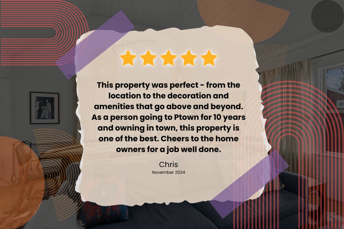 You will LOVE how close you are to everything, but removed from the late-night chaos in the town center. You can easily access everything in town by foot and, because the ferry is so close to the house, you can get into town by boat from Boston and never need a car. (The Ptown airport is a 7-minute car ride away.) You may want bikes to get to Herring Cove or Race Point Beach — there are two bike shops offering well-priced daily or weekly rentals within a 5- or 10-minute walk. The homes nearby are a combination of year-round residents, seasonal residents, and vacation rentals. Live like a local, but please be mindful that your vacation may be our neighbor's full-time home. When you're coming and going, please be extremely quiet and keep conversations down. Quiet hours are from 8pm - 8am. Please be aware that, like most streets in Provincetown, homes on our street are densely situated, and it’s difficult for us to control any noise from our neighbors. Most of the time when we’re there, we hear nothing.